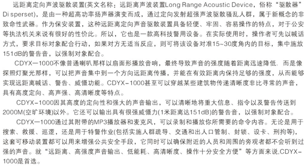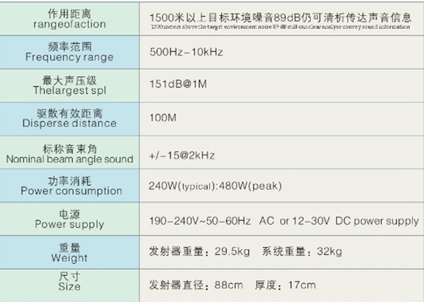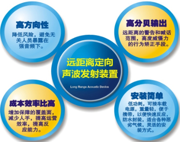 與傳統的擴音系統比較,遠距離定向聲波發(fā)射裝置是一種革命性的新技術(shù)。它具有非常的遠射功力,可以將聲音信息清晰地傳遞到數百米以外,甚至能穿越某些建筑物;它具有強大的震懾威力,可以逼迫受眾自動(dòng)離開(kāi)禁入區域;它具有精準的定向能力,可以瞄準一定角度發(fā)射難以承受的刺激性聲波,而在其它角度卻無(wú)不適。