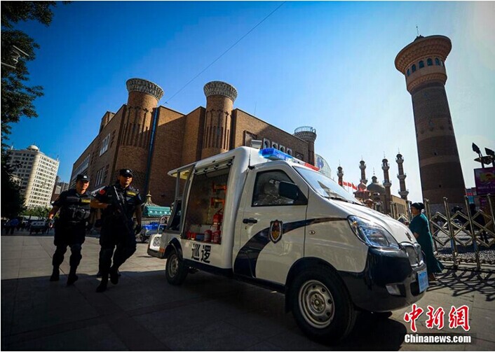 8月28日,一輛新型反恐電動(dòng)巡邏車(chē)亮相新疆首府烏魯木齊市國際大巴扎,該車(chē)由電力驅